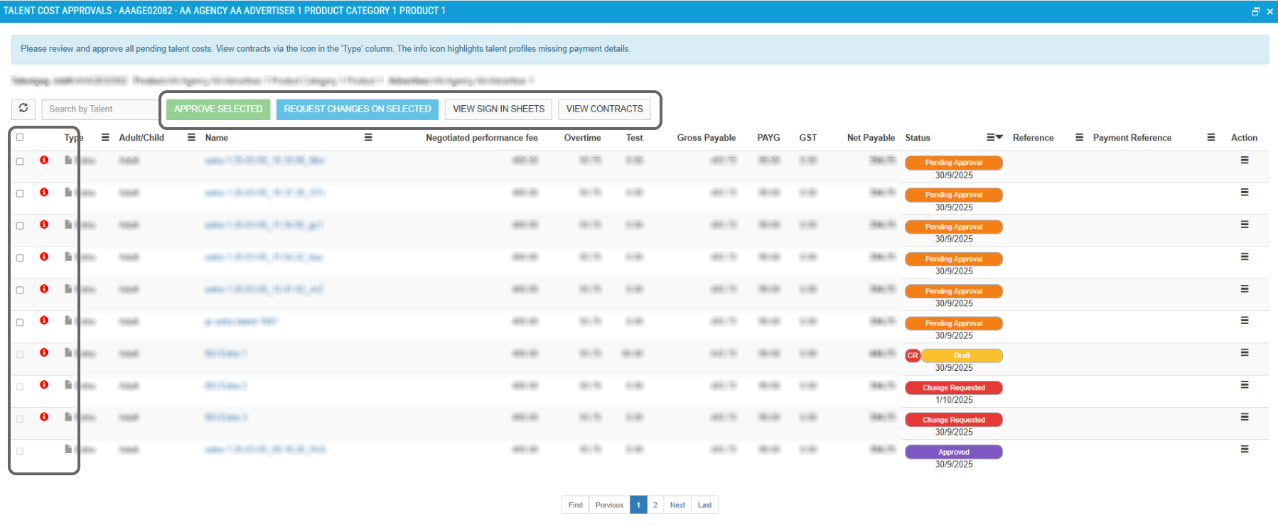 - Red Info Icon: Highlights the Talentpay profile needs updating. Click the name and complete the Personal and Financial tabs to avoid payment delays.